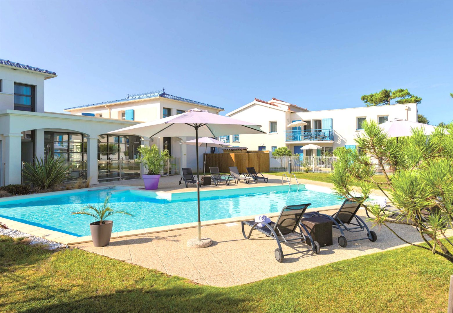 L’établissement propose une offre de services globale : accueil, piscine chauffée, sauna, blanchisserie, Wi-Fi, parking, espaces verts. La résidence se compose d’environ 70 appartements répartis dans 7 bâtiments d’un étage (copropriété).